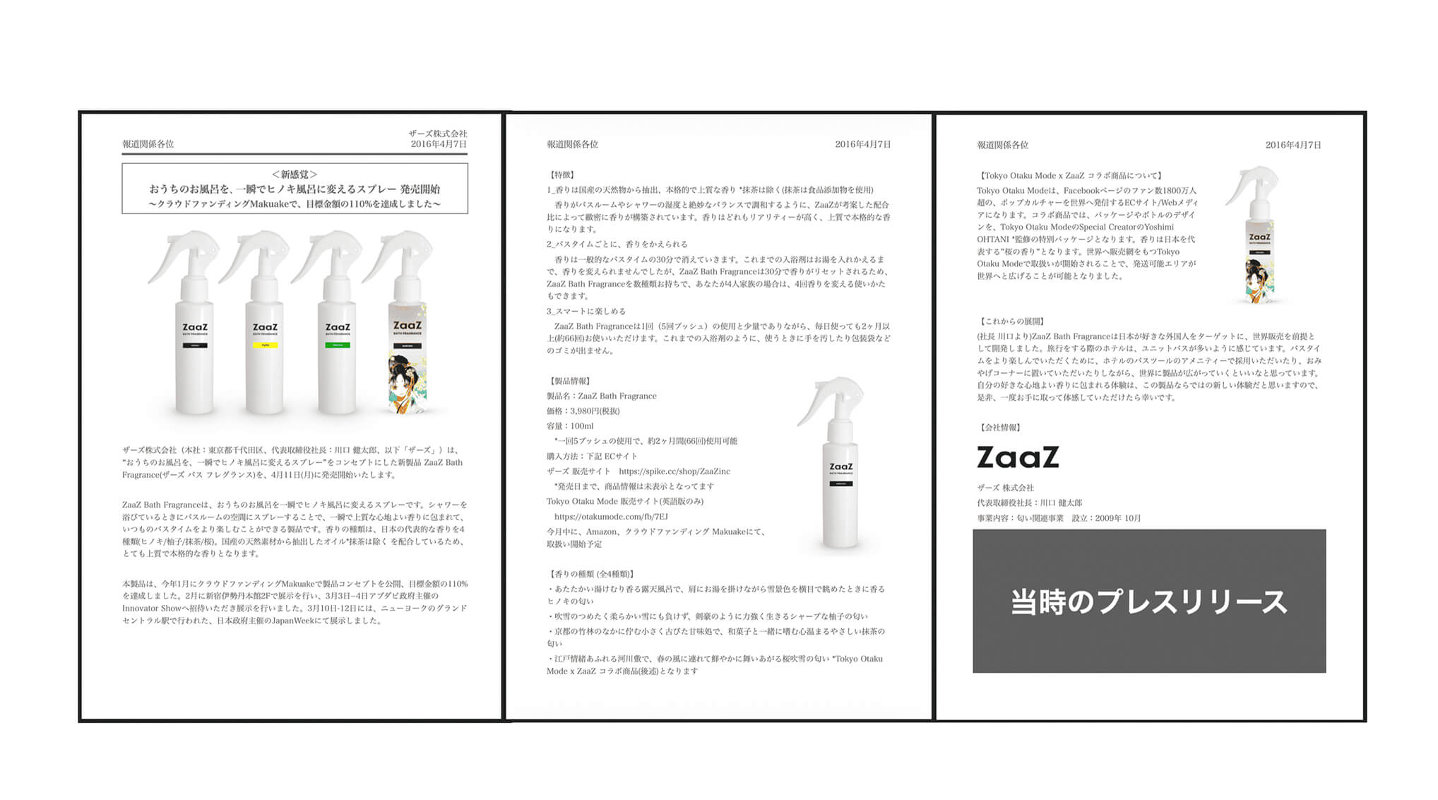 Aiming to expand sales channels, I pursued crowdfunding, which was booming at the time, especially in the U.S. We developed a fragrance spray that instantly turns a home bath into a hinoki (Japanese cypress) bath, and successfully reached our funding goal.